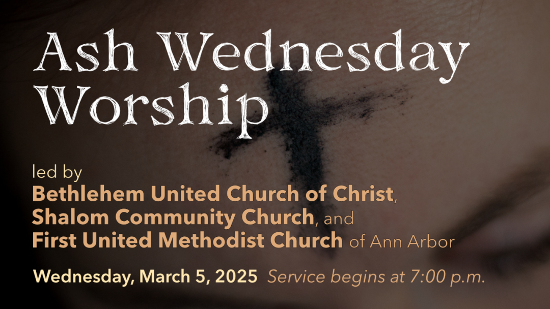 Our Ash Wednesday worship service this evening is led by Bethlehem United Church of Christ, Shalom Community Church, and First United Methodist Church of Ann Arbor.